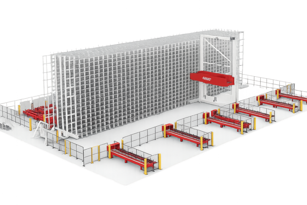 MAXIˢᵀᶜ is a Stacker Cranes AS/RS designed for high-volume storage and automated handling of long and heavy materials.