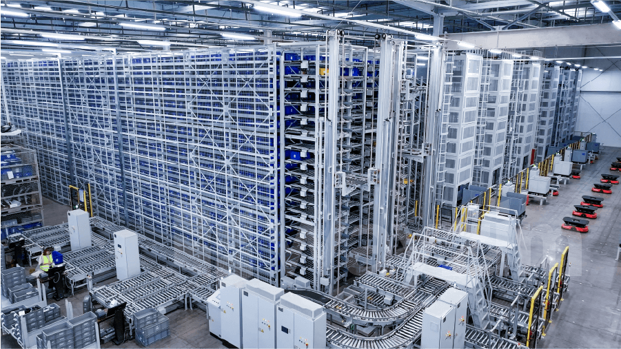 The multi-level shelf system (17 levels for the tote AS/RS and 5 levels for the pallet AS/RS) utilises the vertical space, doubling the storage capacity with the same floor area.