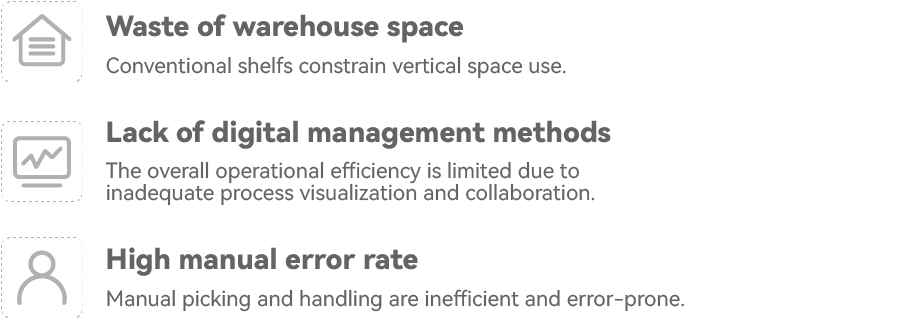 The customer is a leading automaker in China. The parts warehousing management efficiency of its R&D center has a direct impact on the R&D progress and testing continuity of new vehicle models. Due to low space utilisation, high manual error rate, and slow response, conventional warehousing methods cannot meet modern automakers’ requirements for frequent inbounds/outbounds, a massive number of SKUs, and small batches.